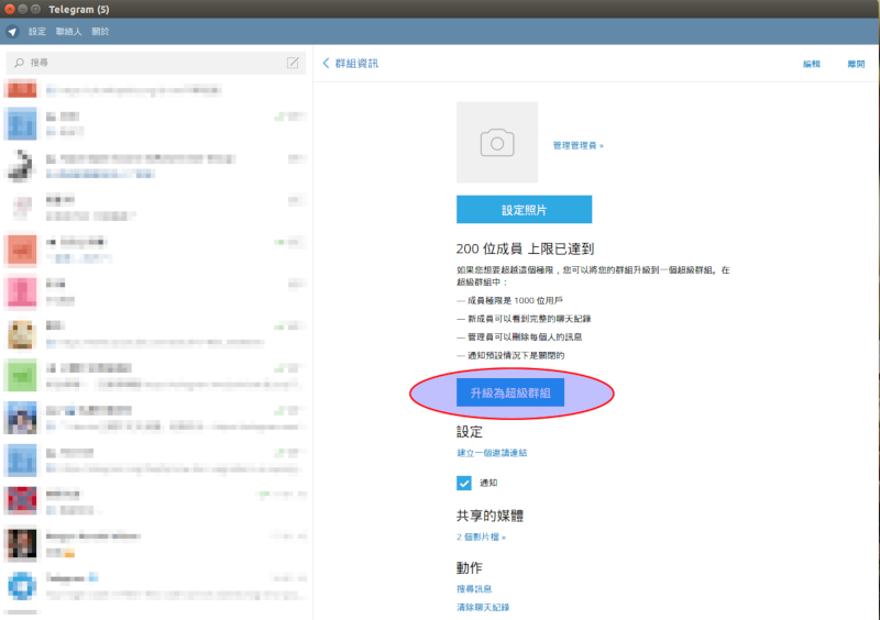 當您的群組達到成員限制(目前為200個用戶),可以將它升級為一個可聚集更多人的超級群組,支援高達1000個成員。要做到這一點,請前往群組中的"